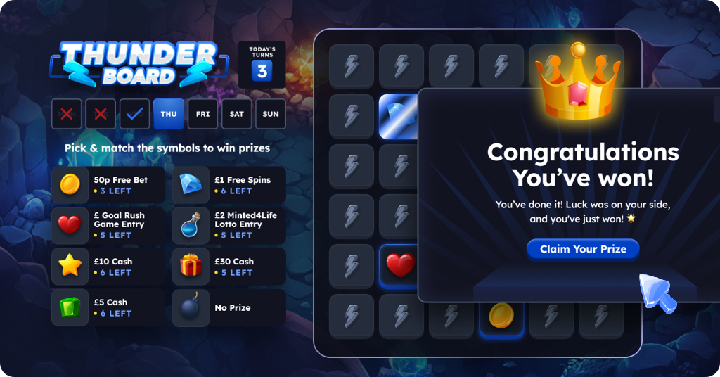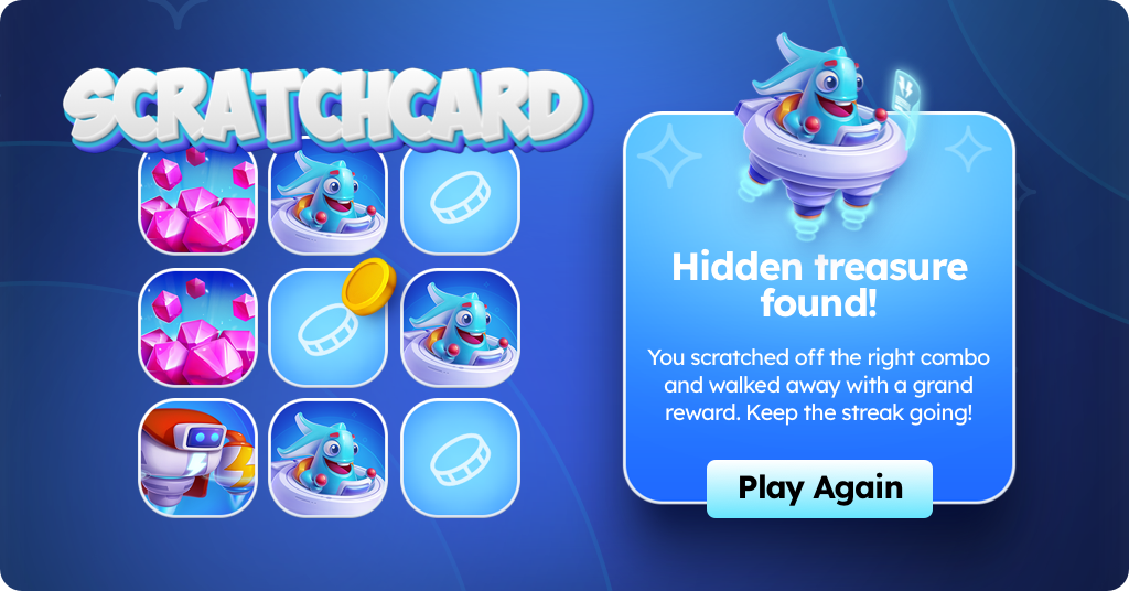 Instant gratification meets data capture. A virtual scratch card reveals a prize or reward, then feeds the outcome back into your campaign automation. Use it to surprise players, reward loyalty, or re-ignite churned users.